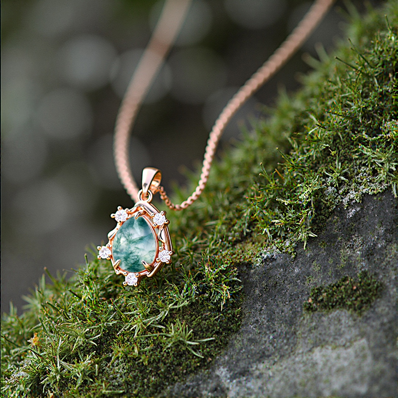 1.29CT Pear Cut Moss Agate & Round Cut Moissanite S925 Silver Organic Halo Pendant Necklace